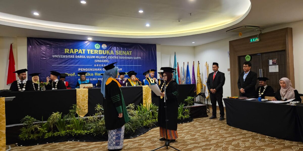 Rapat Terbuka Senat Universitas Darul Ulum Islamic Centre Sudirman Guppi (UNDARIS) menggelar prosesi pengukuhan Guru Besar pada Kamis (5/3/2026) pukul 09.00 WIB. Acara berlangsung khidmat di The Wujil Resort & Convention yang berada di Kecamatan Bergas, Kabupaten Semarang. Dalam sidang terbuka tersebut, Eka Handriyani resmi dikukuhkan sebagai Guru Besar dalam bidang Manajemen Keuangan pada Fakultas Ekonomi dan Bisnis (FEB) UNDARIS.